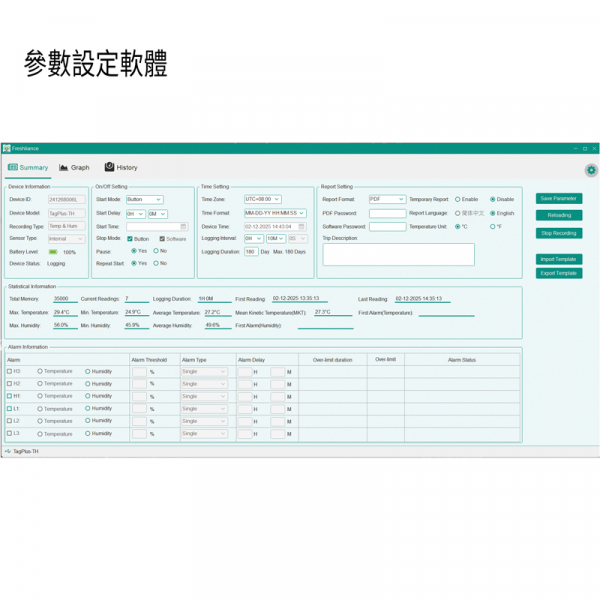 • 可至官網下載Freshliance Tools免費軟體來設定參數,啟動模式、啟動延遲、記錄間隔、停止模式、警報點和其他參數...等