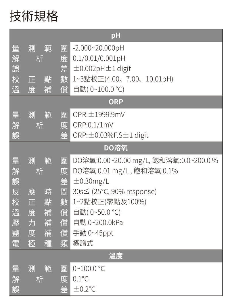 ˙整套包含主機一台、三合一pH塑膠電極D201T-H 1支、ORP塑膠電極DORP301 1支、極譜式溶氧電極DDO01-2M-H 1支、溫度探棒DTEMP-02H 1支、pH4、pH7及pH10校正液50mL、84μS、1413μS、12.88mS/cm 50mL、溶氧電極電解液30mL、溶氧電極膜頭3個、TYPC-C充電線、說明書、鋰電池、硬質外盒