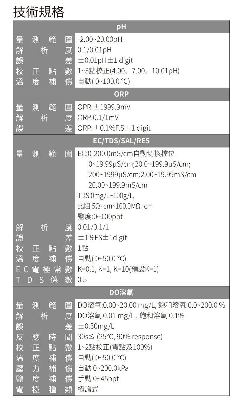 ˙整套包含主機一台、pH玻璃電極D201T 1支、電導度N塑膠電極DCON201T(K=1) 1支、極譜式溶氧電極DDO01-2M 1支、pH4、pH7及pH10校正液50mL、84μS、1413μS、12.88mS/cm 50mL、溶氧電極電解液30mL、溶氧電極膜頭3個、電極支架、說明書、變壓器