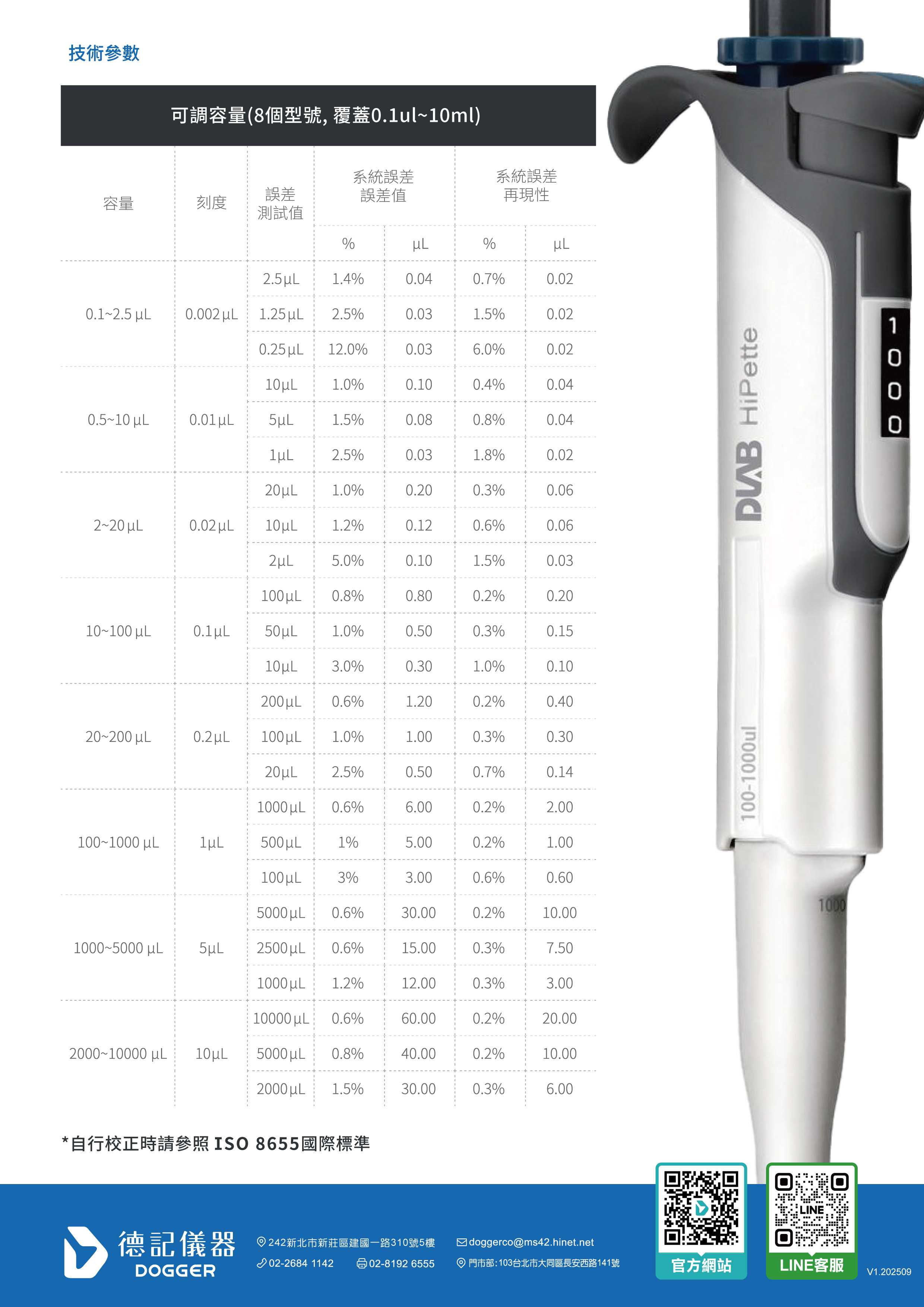注:規格表內誤差值與再現性為生產實驗室環境所量測之數據,僅供參考,使用校準應參考標準ISO8655-2