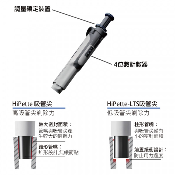 ˙採用LTS(LiteTouch System)技術,減少密封接觸面積,降低摩擦力,防止安裝吸頭時過度用力,輕鬆退管