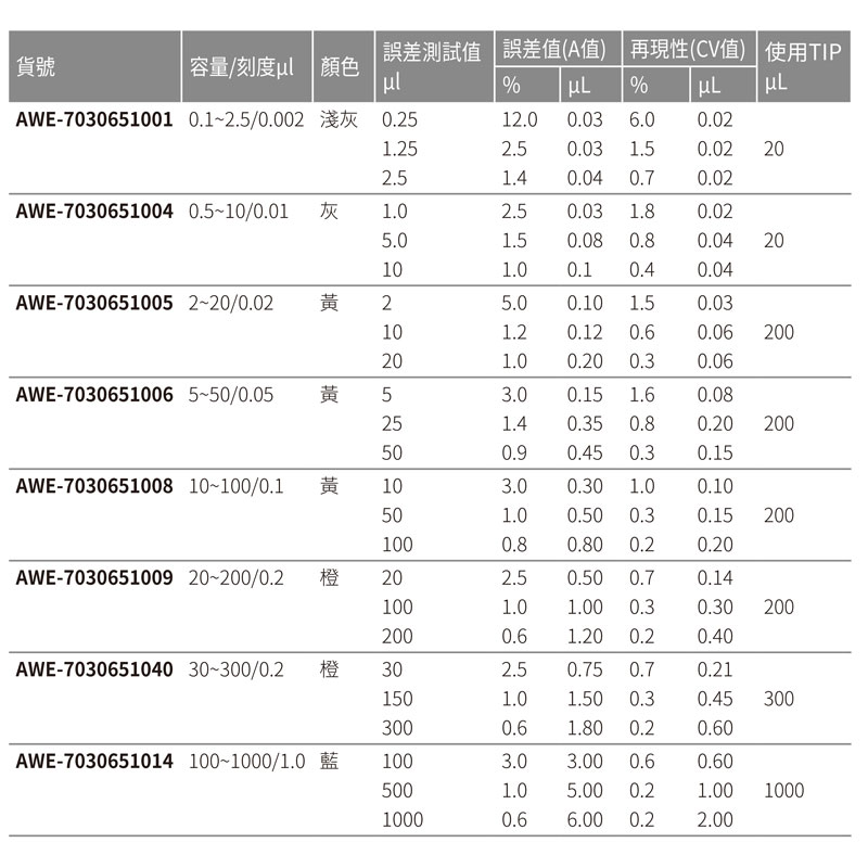 注:規格表內誤差值與再現性為生產實驗室環境所量測之數據,僅供參考,使用校準應參考標準ISO8655-2