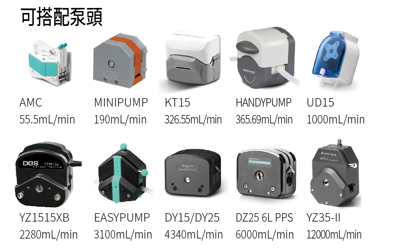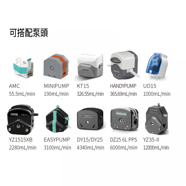 • 每個蠕動泵可以是相同或是不同泵頭,例如迷你蠕動泵,標準蠕動泵或工業蠕動泵