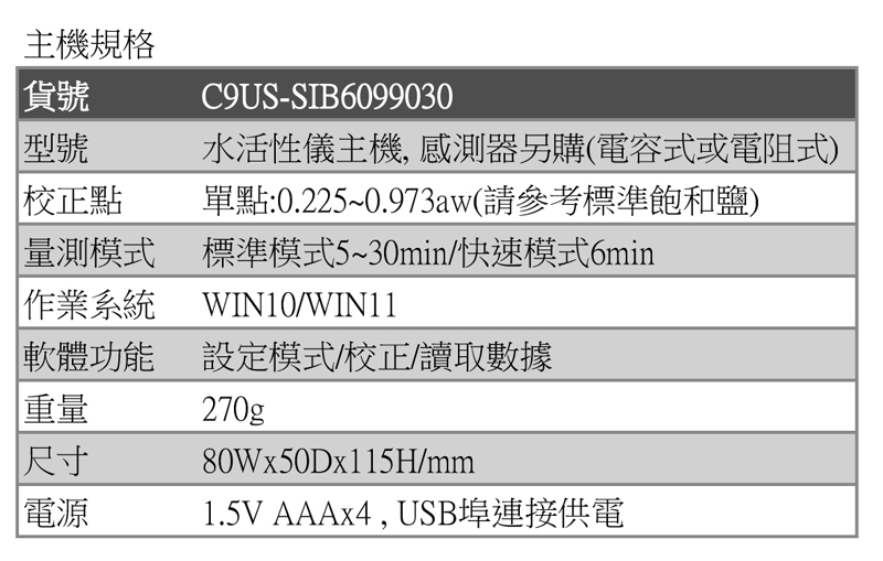 ˙使用標準飽和鹽進行單點校正,校正值可直接儲存至獨立感測器中,適合量測不同種類的樣品.標準鹽另購