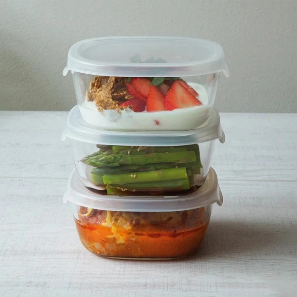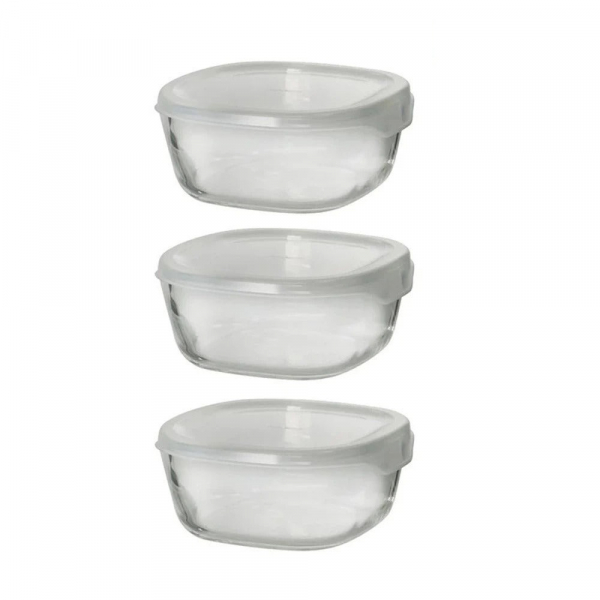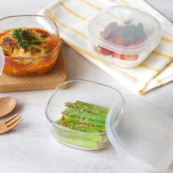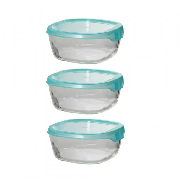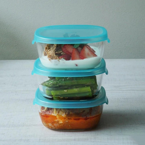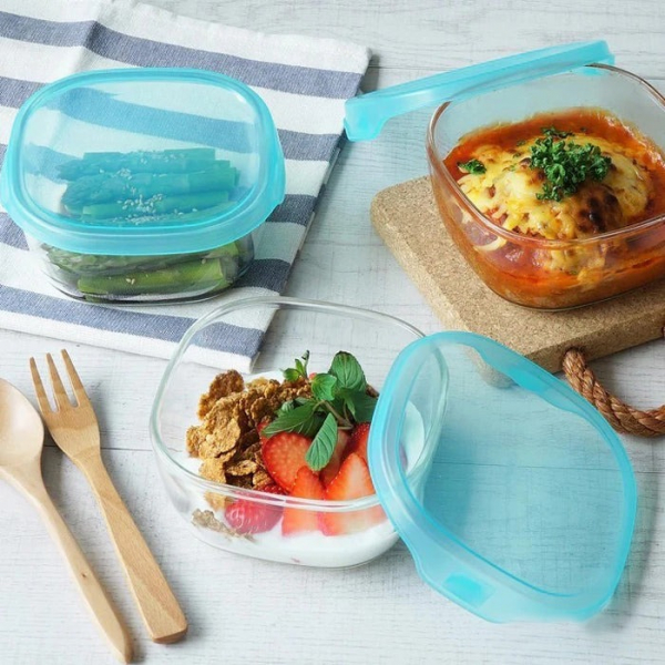 HARIO 方形玻璃保鮮盒3件組 清透藍/鮭魚粉/透明色(KST-3008-TAQB/TSP/TW)