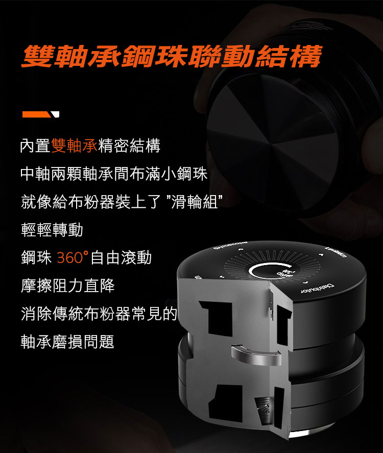 採用雙軸承旋轉結構,在布粉過程中提供穩定、順暢的旋轉手感,有助於更均勻地整理咖啡粉層表面,減少晃動與不規則轉動,讓每次布粉動作更一致。