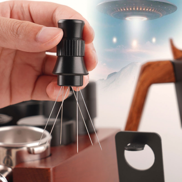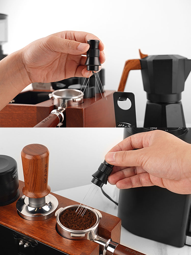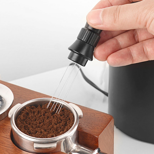 透過細針進行 WDT 散粉梳理,有助於打散研磨後產生的結塊,改善粉層集中與不均問題,讓咖啡粉分布更平均,為後續填壓與萃取建立穩定基礎。(實際效果會依研磨度與操作方式有所差異)