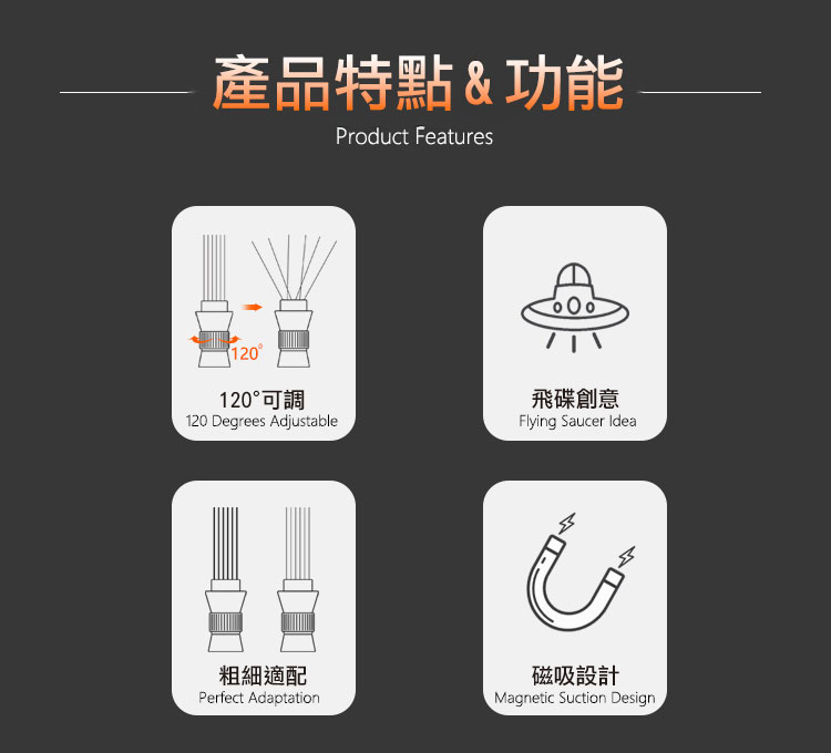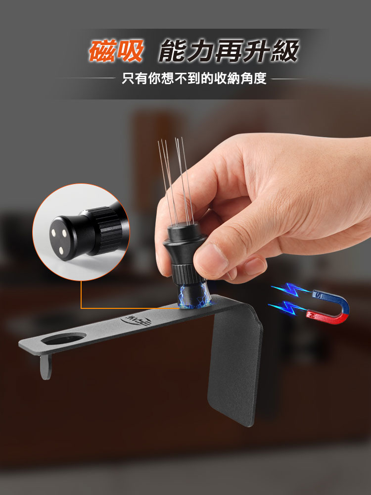 散粉針與底座採磁吸設計,使用後可自動定位吸附收納,避免細針接觸桌面,保持工作檯面整潔,同時兼顧美觀與便利性。